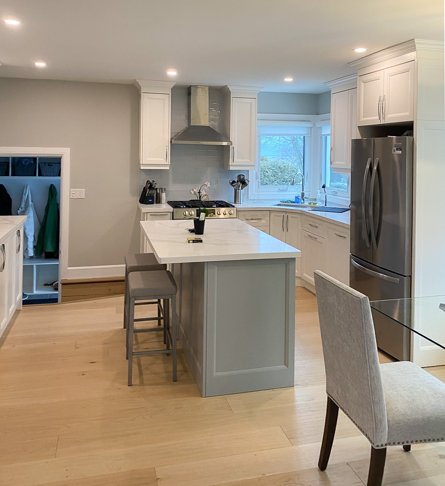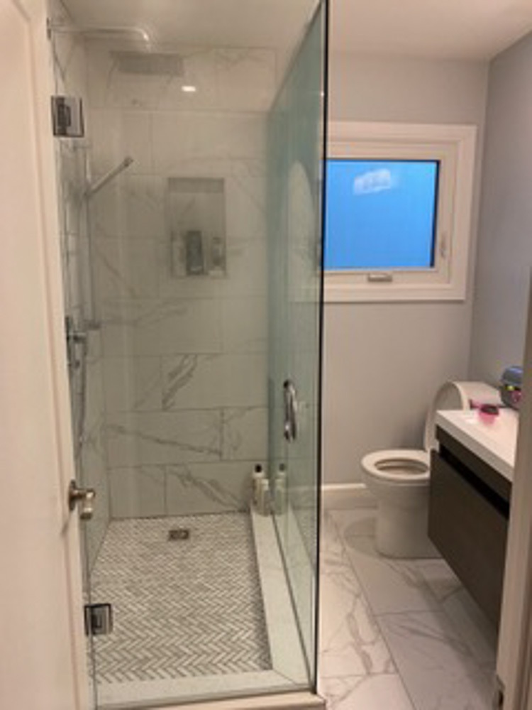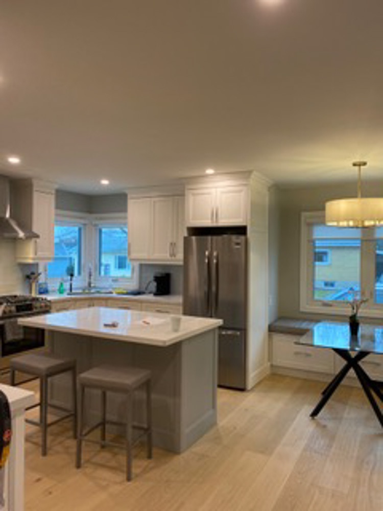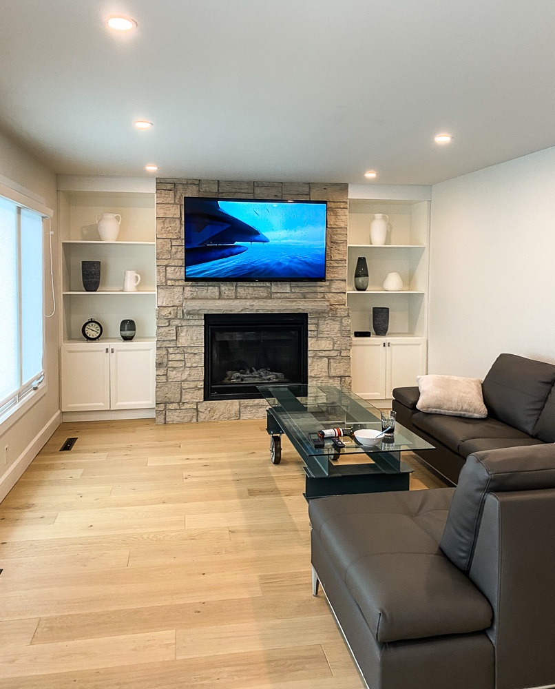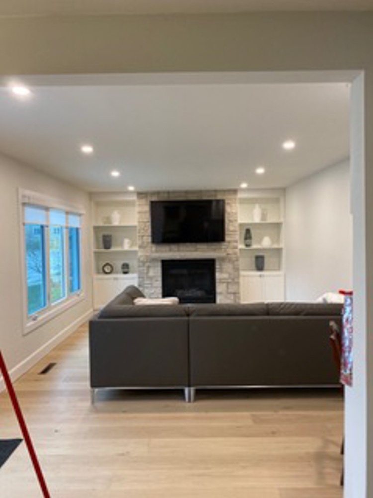 This was no small job since plumbing, electrical and a supporting wall also needed to be replaced. This project consisted of new electrical installations,  including pot lights, engineered hardwood floors, heated tiled bathrooms using the schluter systems and a complete custom kitchen installed.