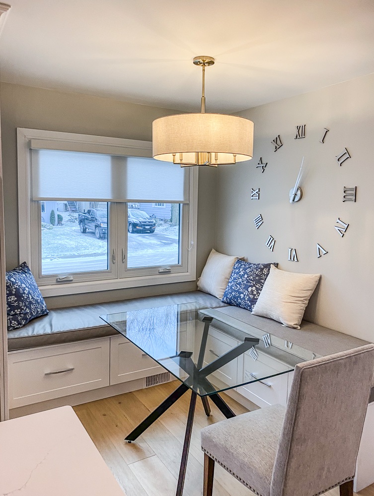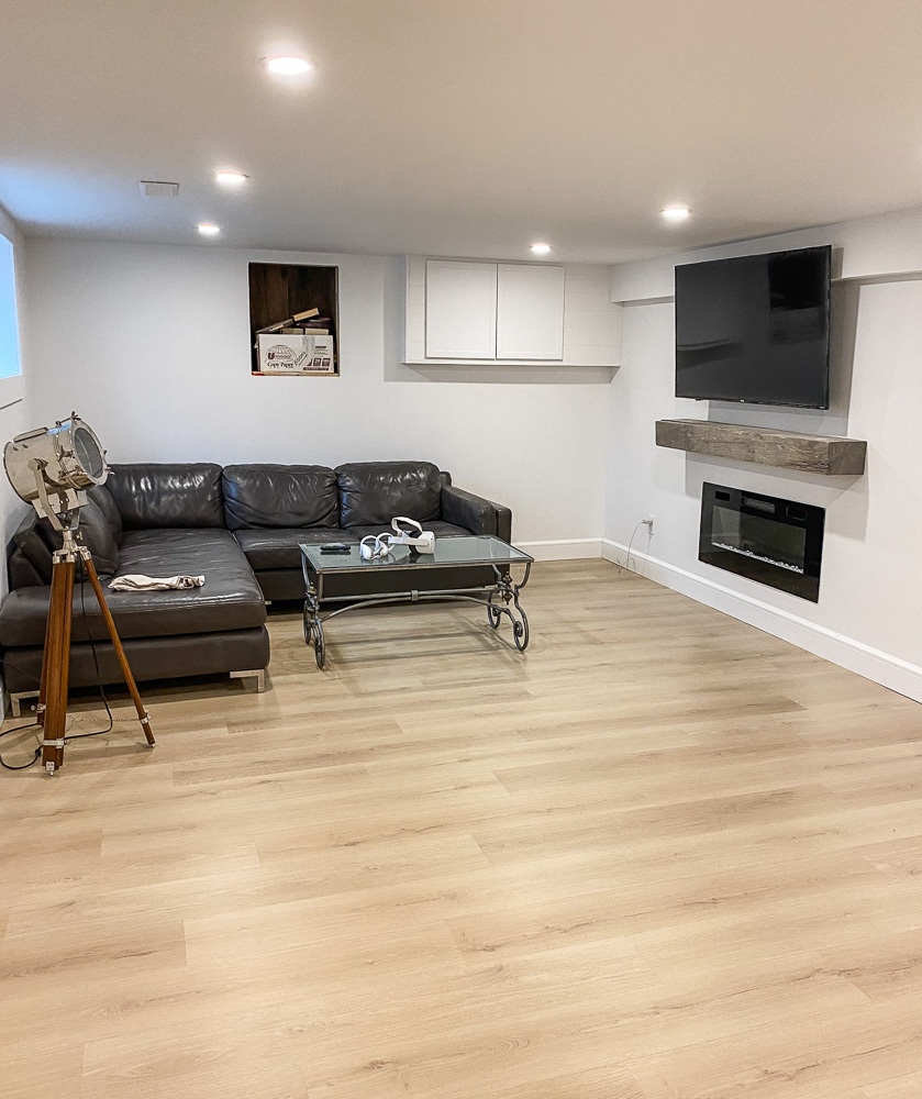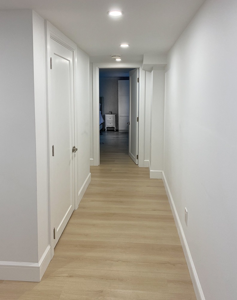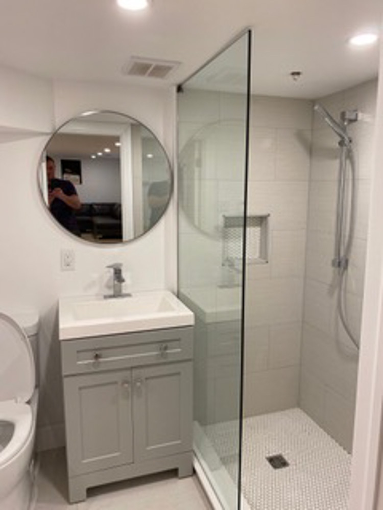 This was no small job since plumbing, electrical and a supporting wall also needed to be replaced. This project consisted of new electrical installations,  including pot lights, engineered hardwood floors, heated tiled bathrooms using the schluter systems and a complete custom kitchen installed.